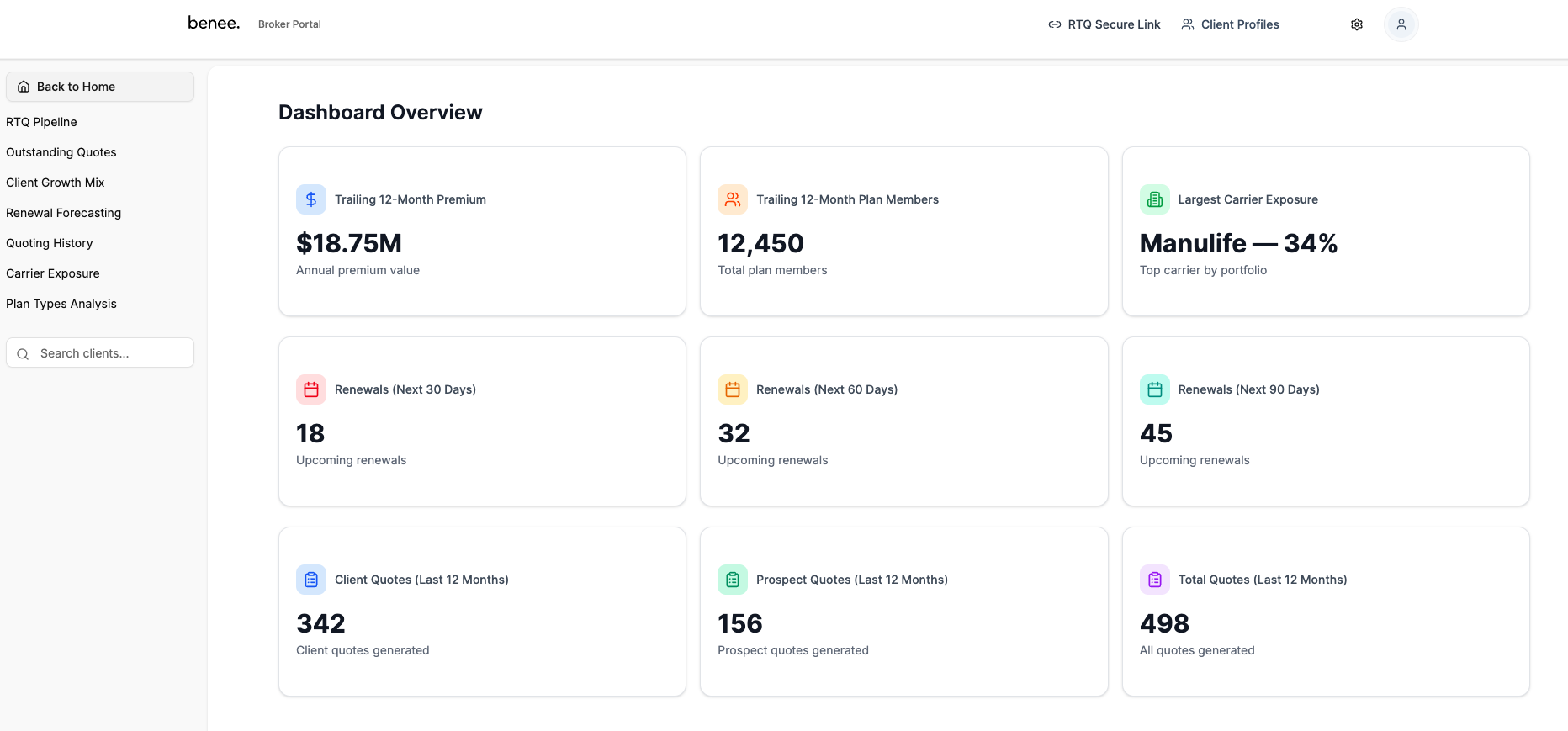 For firms managing hundreds or thousands of groups. Full portfolio visibility, automated quoting, and renewal management across the entire book — white-labeled under your brand. Infrastructure that scales with your book — not your overhead.